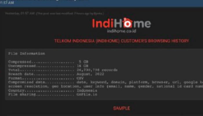 “Data yang bocor di antaranya ; email, No HP, No Indihome, NIK, Alamat IP dll. Pelaku juga mengklaim memiliki akses ke server milik Telkom Indonesia,” ujarnya.