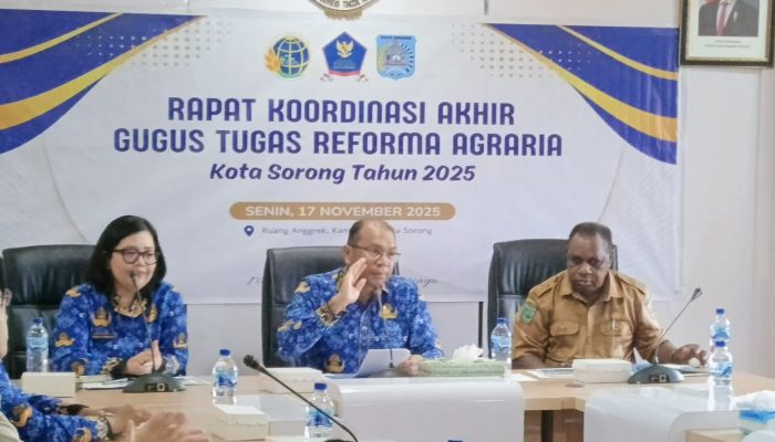 Melanesiatimes.com, Kota Sorong — Plt. Sekretaris Daerah Kota Sorong, Ruddy R. Laku, S.Pi., M.M., secara resmi membuka Rapat Koordinasi Akhir Gugus Tugas Reforma Agraria Tahun 2025, yang digelar sebagai bentuk evaluasi menyeluruh terhadap seluruh kegiatan reforma agraria yang telah dilaksanakan sepanjang tahun berjalan. Ruang Anggrek, Lt.II, Kantor Wali Kota Sorong. Senin, (17/11/2025).